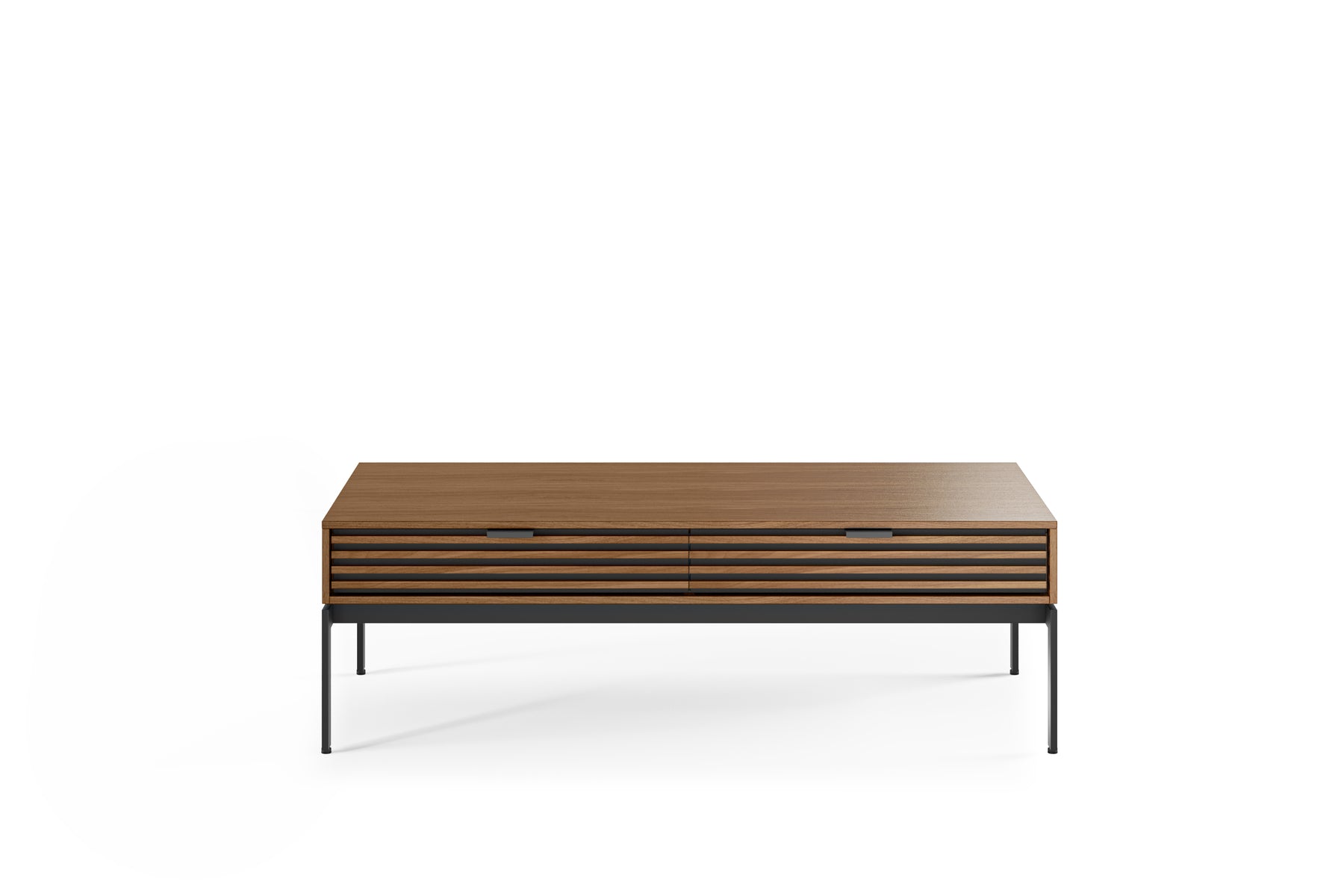 Combining sophistication and a modern aesthetic, the Cora coffee table features louvered hardwoods on the front and back, while two concealed drawers offer practical storage at your fingertips. Create a captivating table grouping in your living space with the Cora collection.