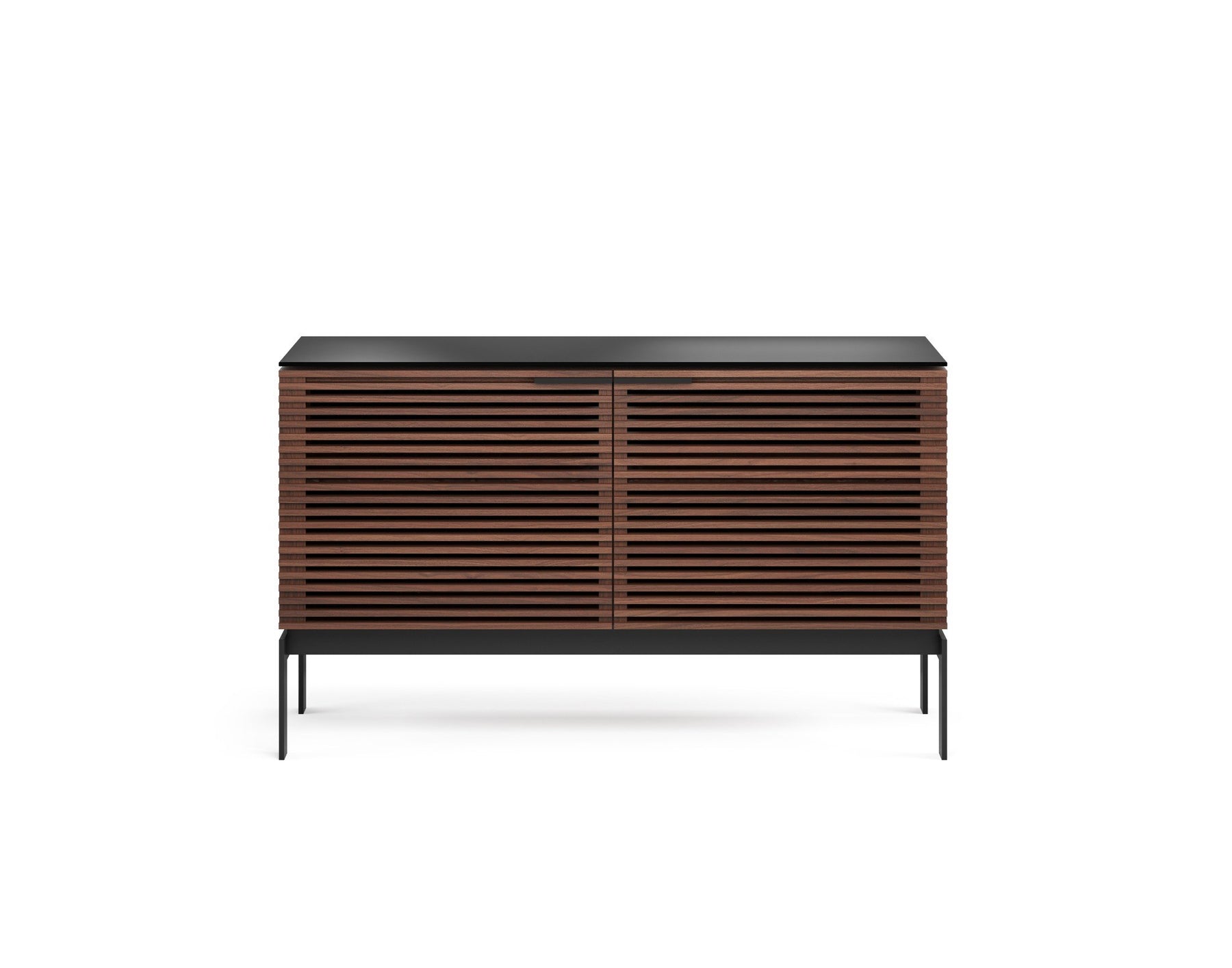 A beautiful storage console in its own right, the Corridor SV 7128 can also be the center of your entertainment system and is perfect for streaming devices, gaming consoles and up to a 60" television. The 7128's slim design makes it an elegant choice for storage or as an entertainment center for a small home theater system. Louvered doors conceal the cabinet's contents while still allowing remote control access. Storage compartments provide ample space, including a perfectly positioned soundbar shelf to enhance your media center's audio performance, and includes an unbelievably soft and durable satin-etched glass top — part of the award-winning Corridor Media Collection.