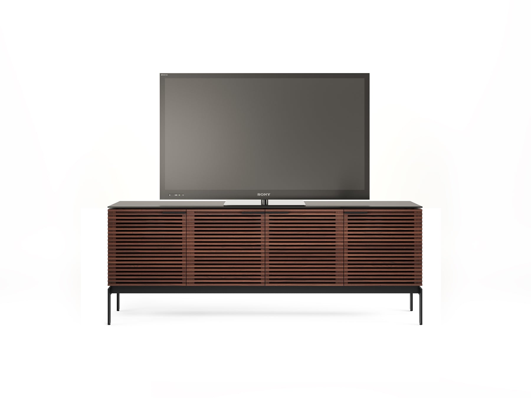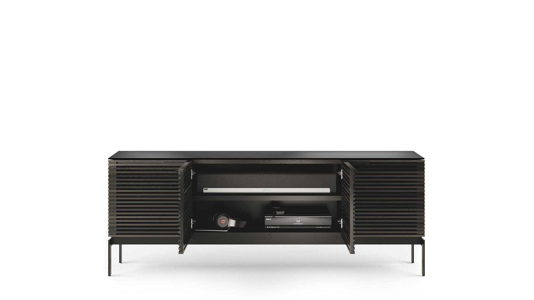 A beautiful storage credenza in its own right, the Corridor SV 7129 can also be the center of your entertainment system and is perfect for streaming devices, gaming consoles and up to an 80" television. The 7129's slim design makes it a versatile choice in a dining room or hallway, or as a TV stand for a compact home theater system. Louvered doors conceal the SV's contents while still allowing remote control access. Ventilated storage compartments provide ample space, including a perfectly positioned soundbar shelf to enhance your media center's audio performance, and includes an unbelievably soft and durable satin-etched glass top - part of the award-winning Corridor Media Collection.
