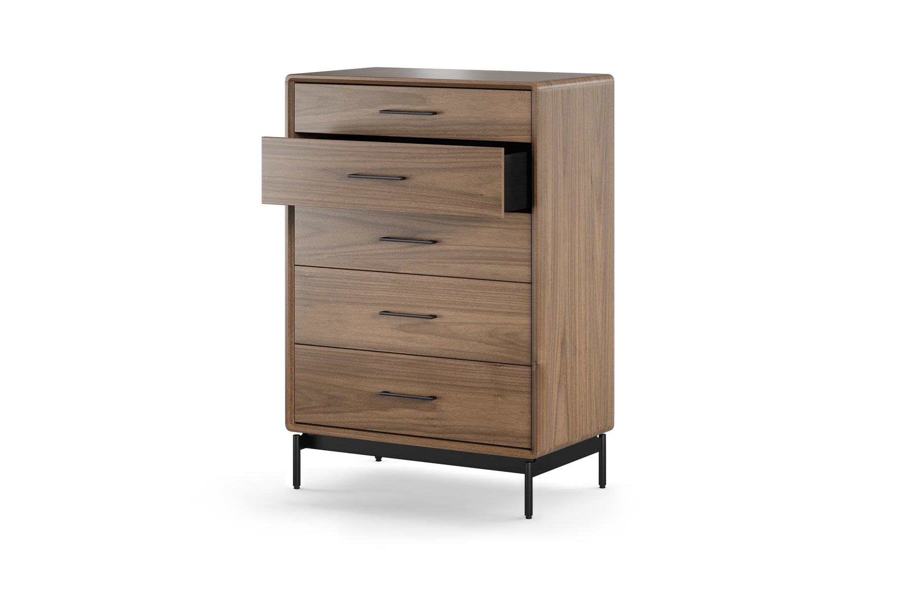 The LINQ 9185 tall 5-drawer modern bedroom wardrobe chest by BDI Furniture features elegant natural wood grains, soft rounded edges, a sturdy metal base, and a proprietary interlock system with roomy self-closing drawers. Crafted with beautiful natural wood grains and smooth rounded edges, the LINQ chest adds modern elegance to any bedroom. Included wire wraps attach to the back to keep cords controlled.