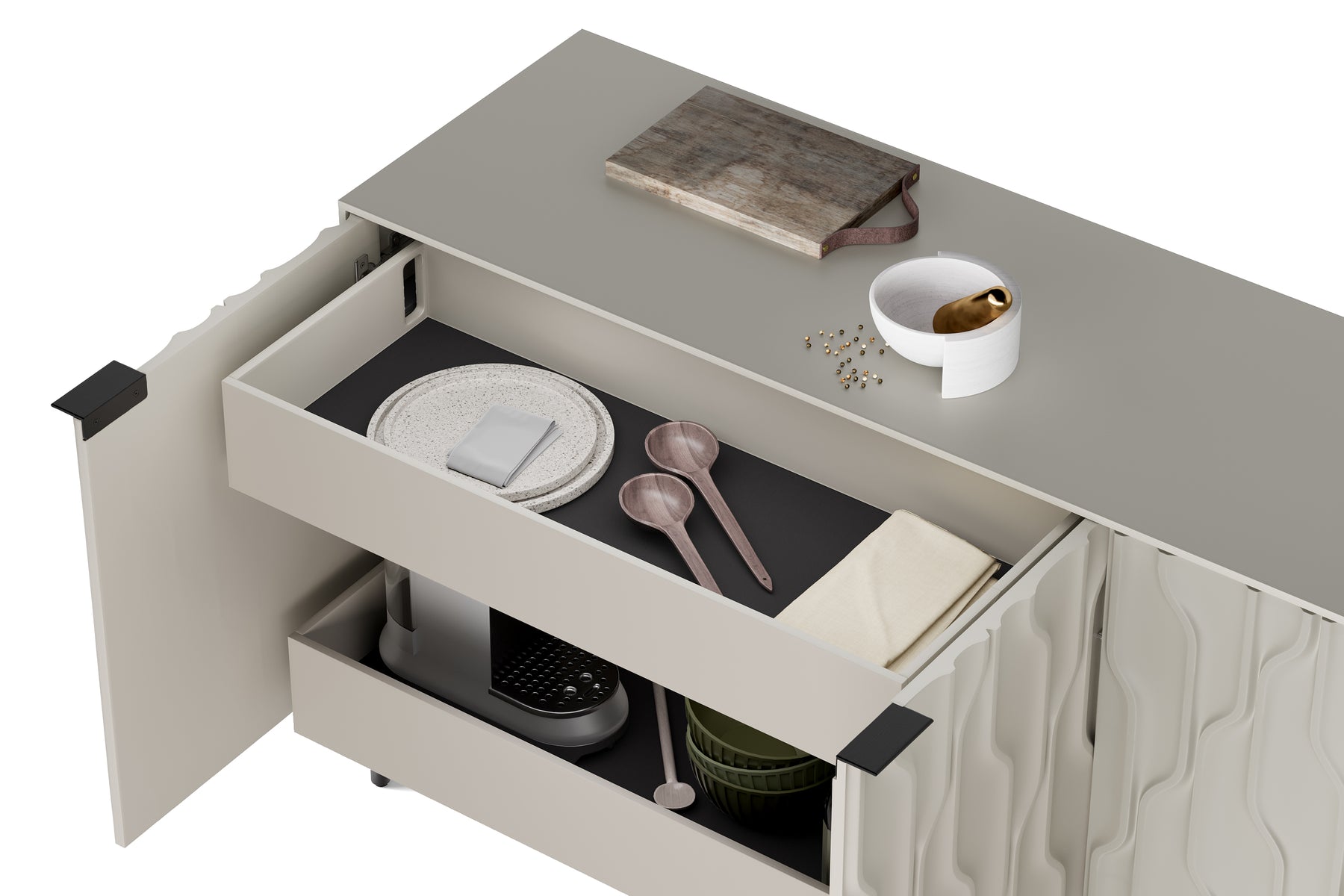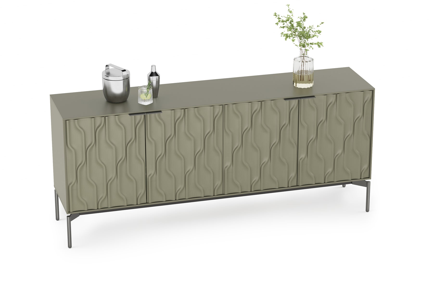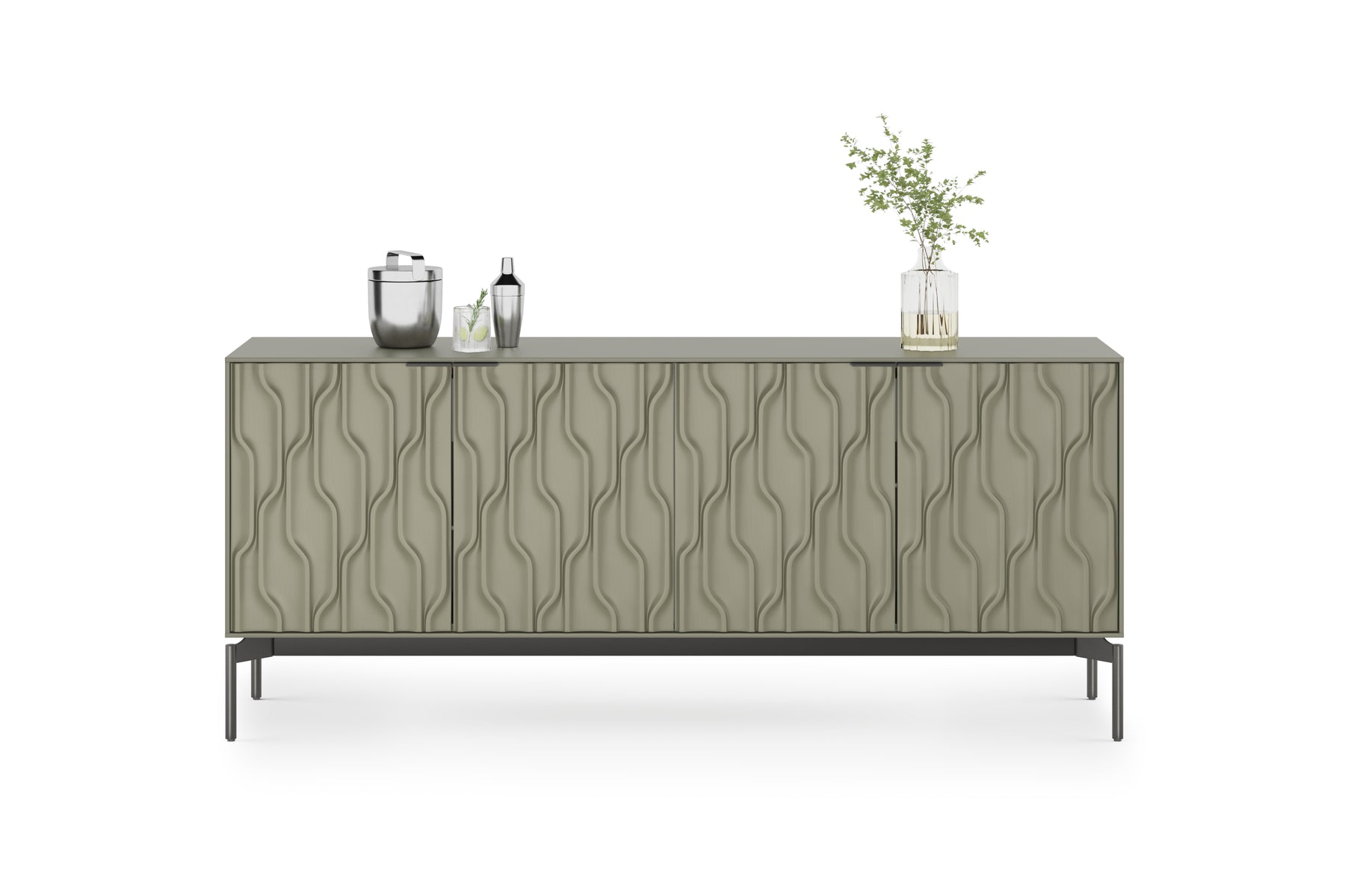 Combining the fluidity of carved doors with a stark rectilinear form, Mesa is not your ordinary storage console. Whether anchoring an entryway or serving as a sideboard or credenza, Mesa provides refined storage with show-stopping style. The interior is fully configurable to meet a diverse range of needs. The shelves and drawers can be repositioned to create a customized storage solution.
