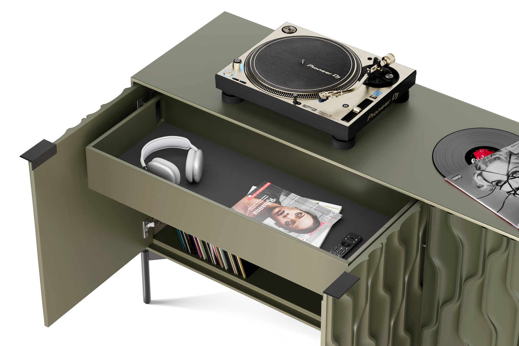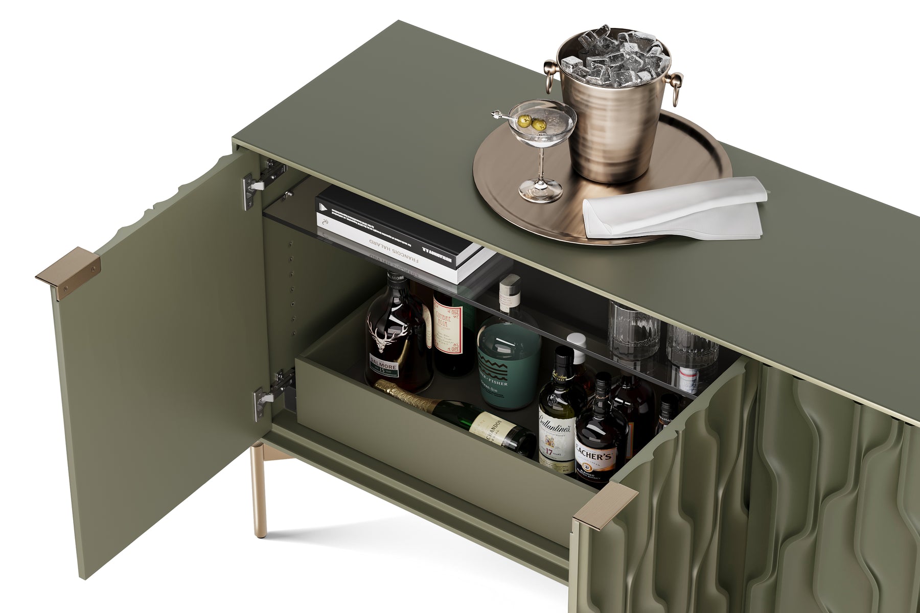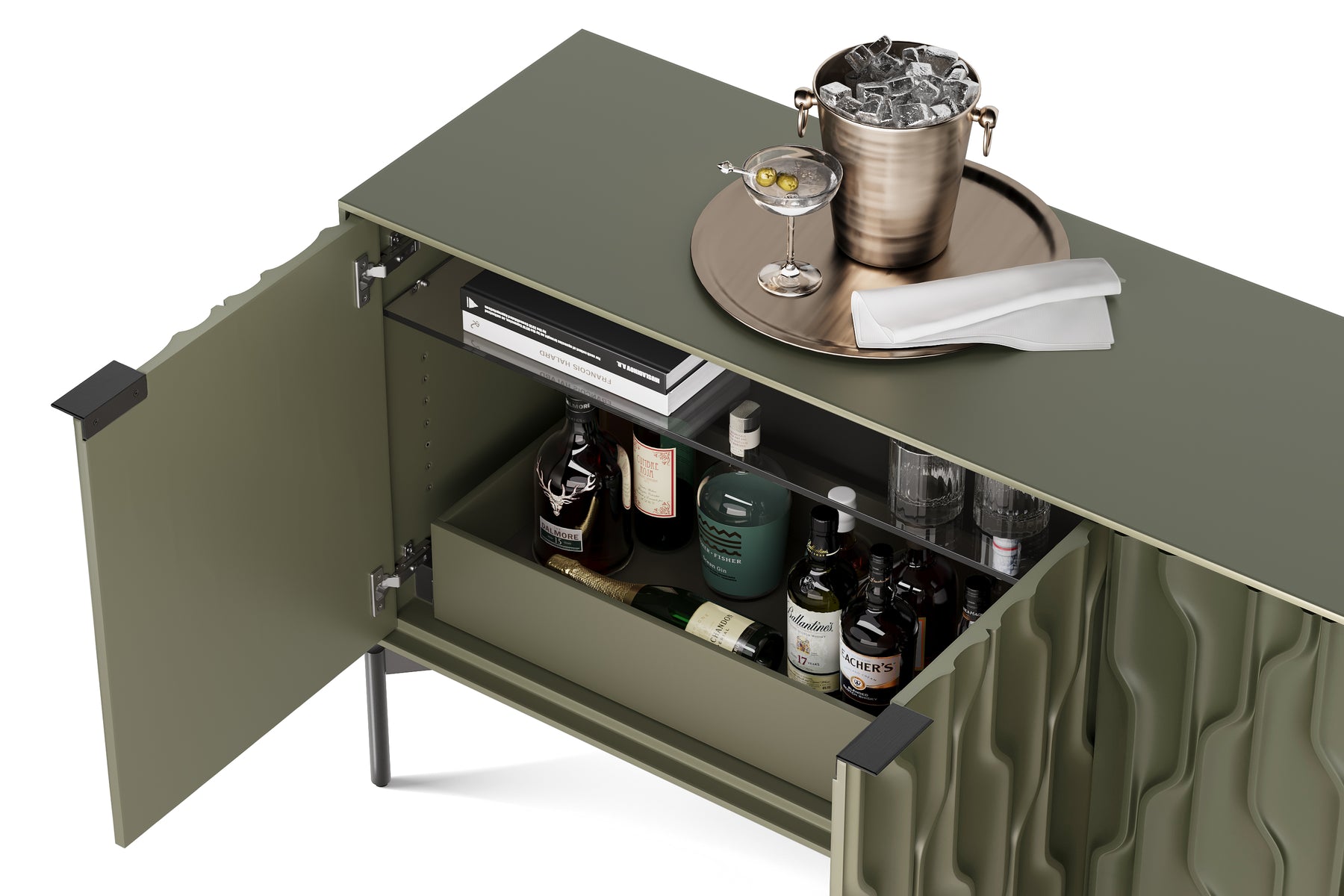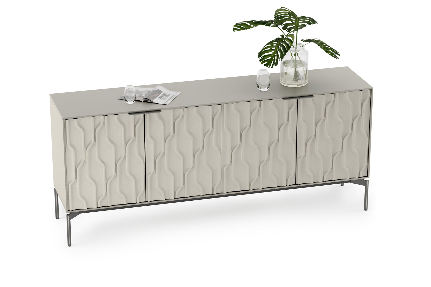 Combining the fluidity of carved doors with a stark rectilinear form, Mesa is not your ordinary storage console. Whether anchoring an entryway or serving as a sideboard or credenza, Mesa provides refined storage with show-stopping style. The interior is fully configurable to meet a diverse range of needs. The shelves and drawers can be repositioned to create a customized storage solution.