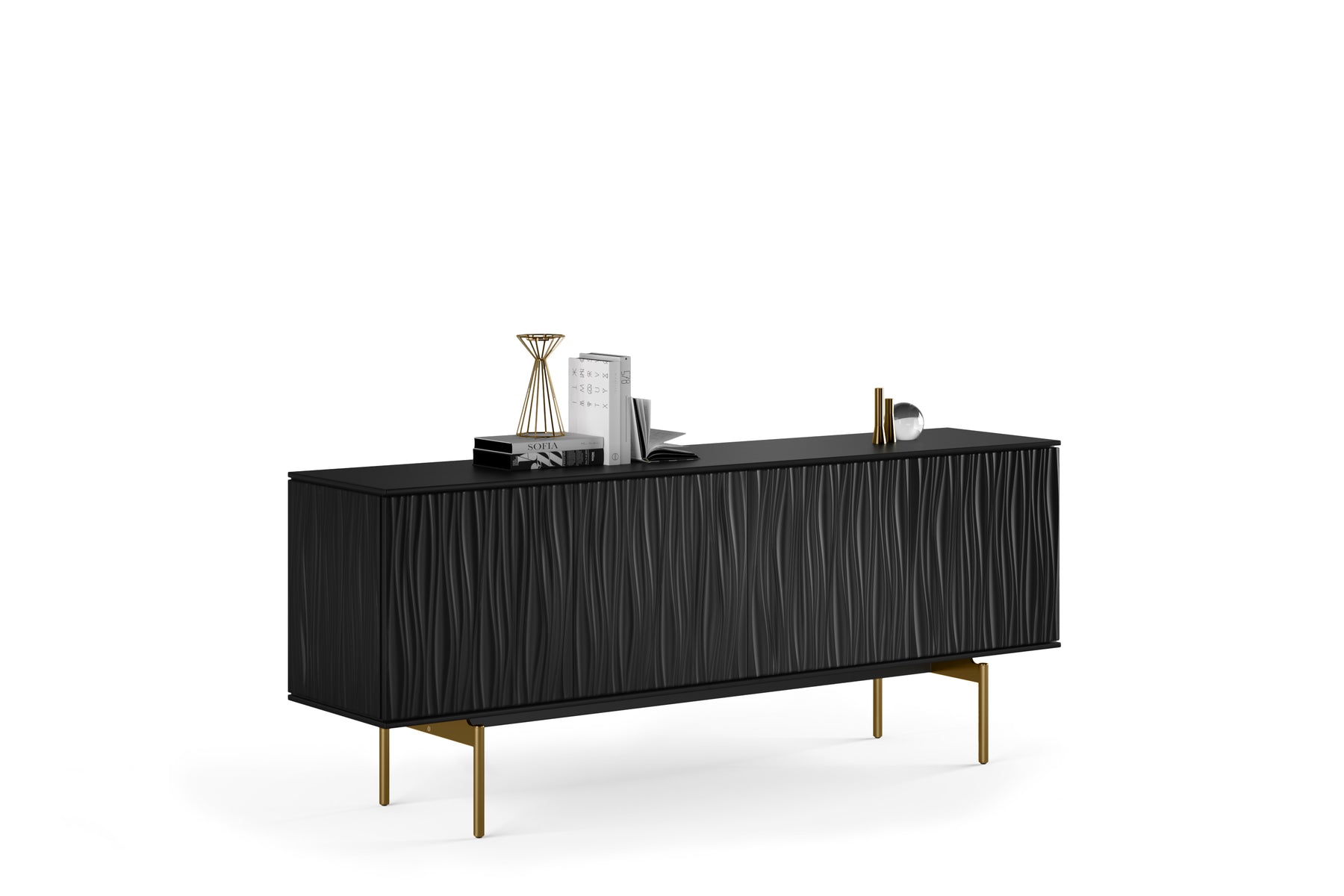 Contrasting straight lines with flowing, sculpted patterns, the stunning design of the Tanami credenza, media console, and storage cabinet is sure to be the focal point of any room. Polished chrome legs provide a distinctly modern and minimalist look, while features such as adjustable shelves and built-in cable management make it perfectly suitable for light AV and media use.
