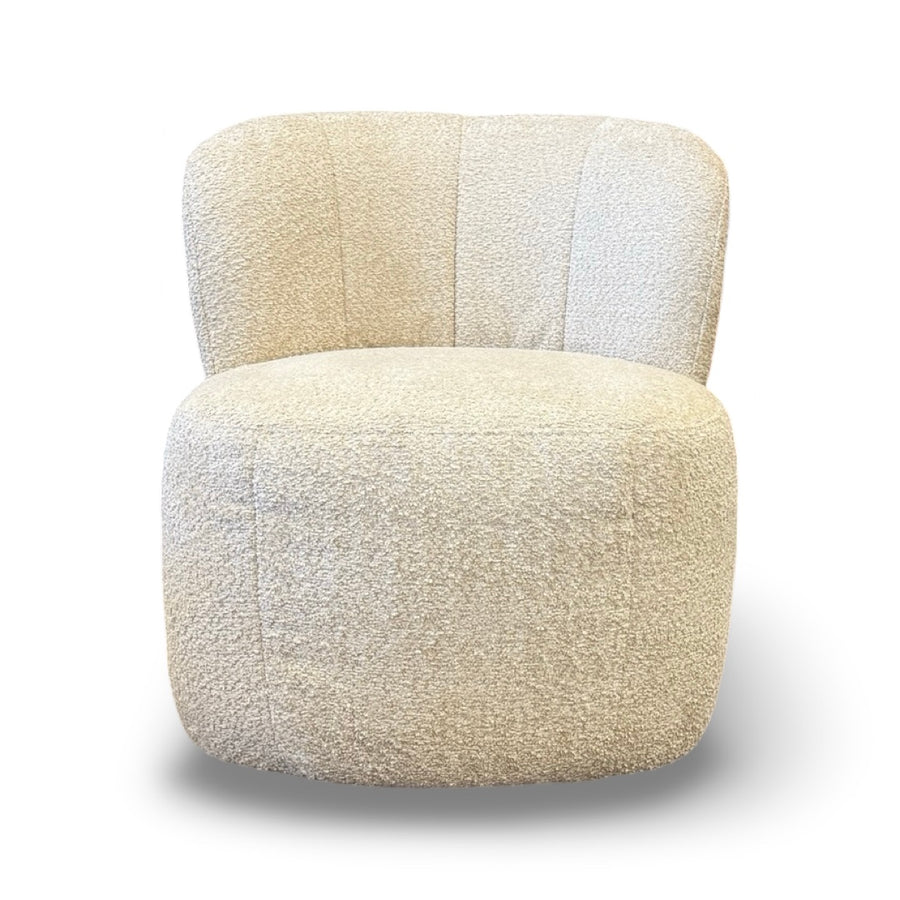 The rounded silhouette and subtle vertical channel detailing offer a minimalist yet cozy look, while the hidden 360-degree swivel base provides smooth, practical movement without compromising design. Whether placed in a living room, bedroom, reading nook, or home office, this statement piece adds warmth and modern elegance to any setting.